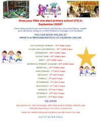 Meet and Greet sessions for F2 Starters of local schools. There's sessions will be held in June and July 2024 Use this as an opportunity to meet parents and children that will be attending the same school as your child. the children will get chance to play and interact with their new friends before the start of term. Please see our Facebook page for more information